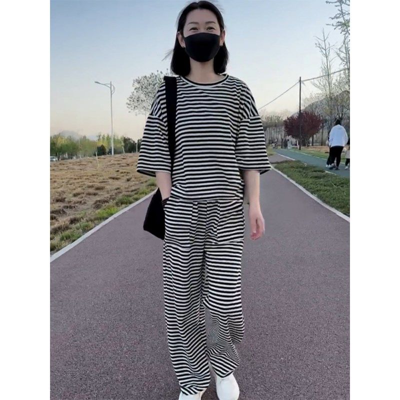 2025夏季新款条纹套装女短袖休闲运动宽松时尚透气夏天女装两件套