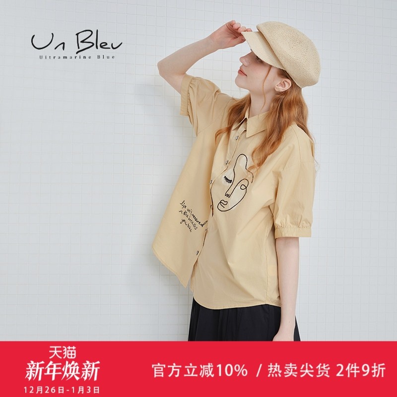 UnBleu纯棉衬衫夏季新款女白短袖气质夏天女装绣花设计感上衣夏季