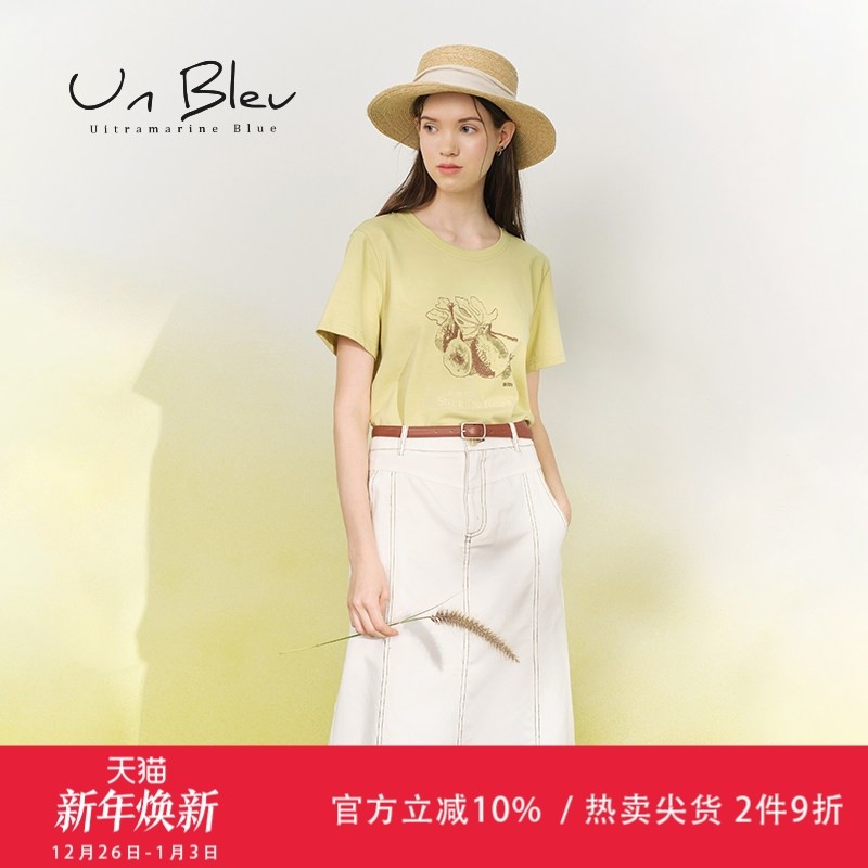 UnBleu短袖t恤女潮牌夏季新款高级时尚夏天女装黄色印花全棉上衣