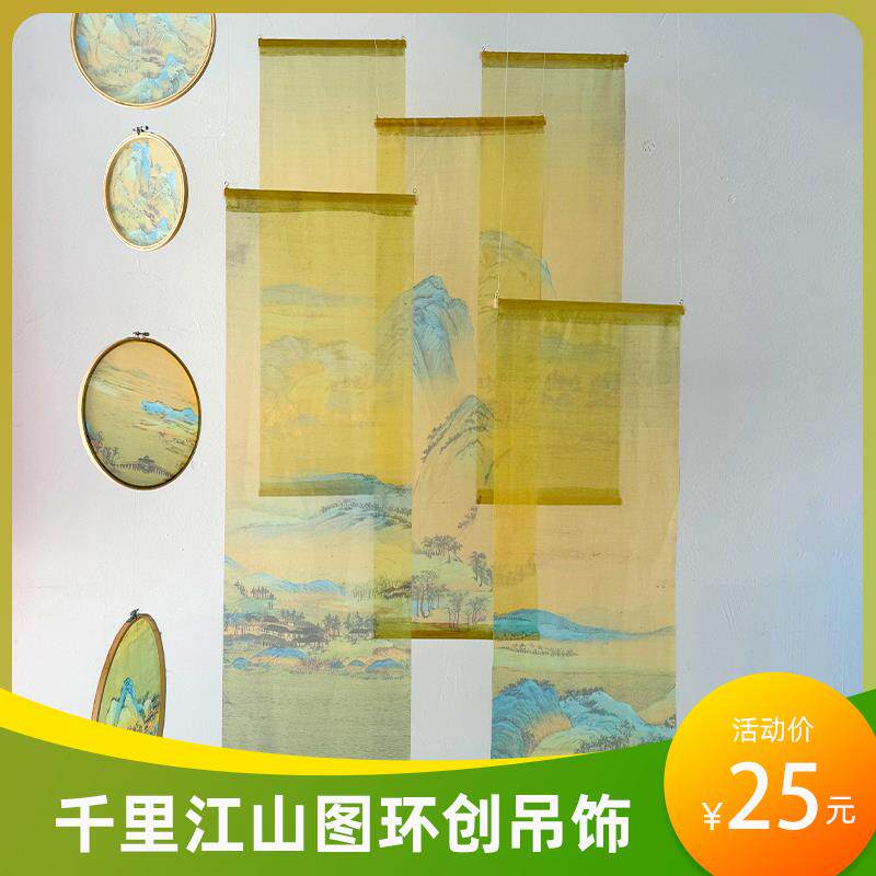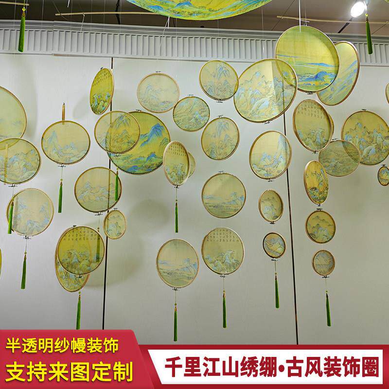 中式橱窗布置半透绣绷非遗美陈挂饰千里江山图环创装饰幼儿园吊饰