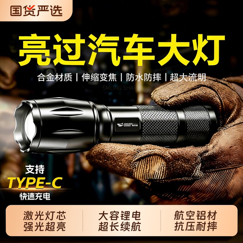微笑鲨军工强光手电筒充电超亮led激光超长续航大容量户外照明灯