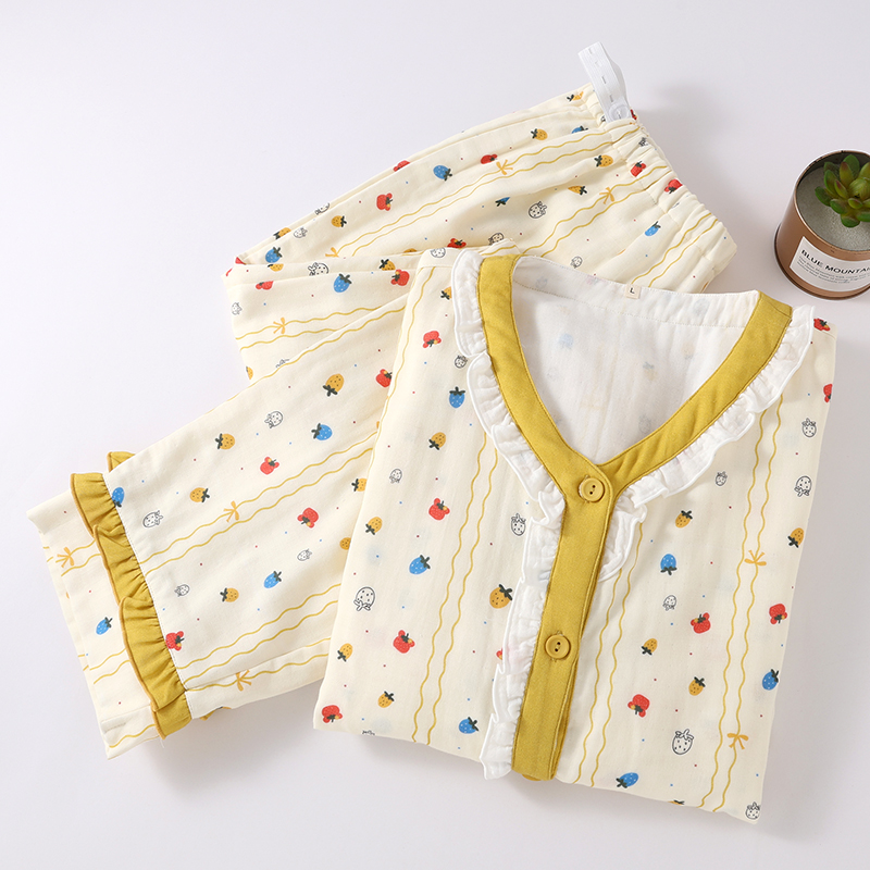 100%纯棉双层纱布月子服春秋长袖睡衣女夏季棉纱全棉麻家居服套装