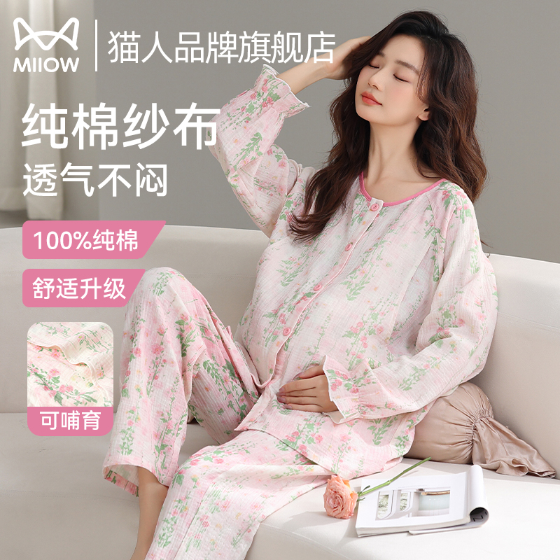 猫人纯棉孕妇睡衣女夏季6月7新款哺乳期吸汗纱布月子服外穿家居服
