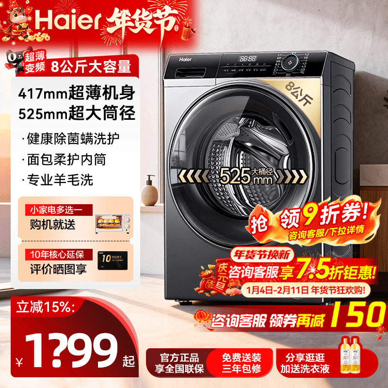 [国补15%]海尔滚筒洗衣机家用全自动8KG超薄10公斤洗烘一体旗舰店