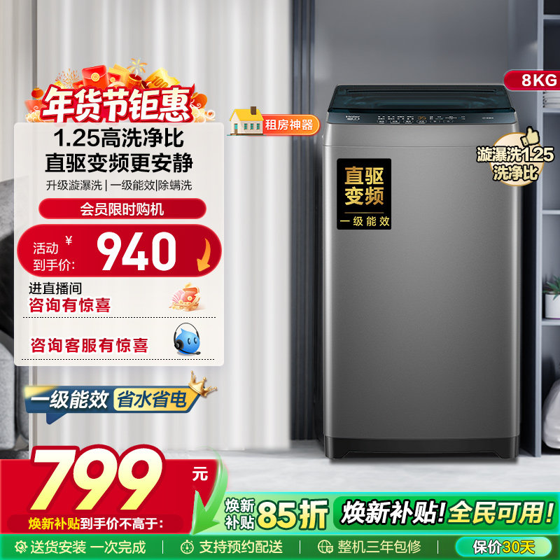 海尔8kg全自动家用洗衣机直驱变频一级能效小型租房波轮洗衣机