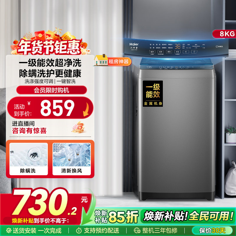 海尔8kg波轮洗衣机一级能效家用全自动大容量租房旗舰店官方正品