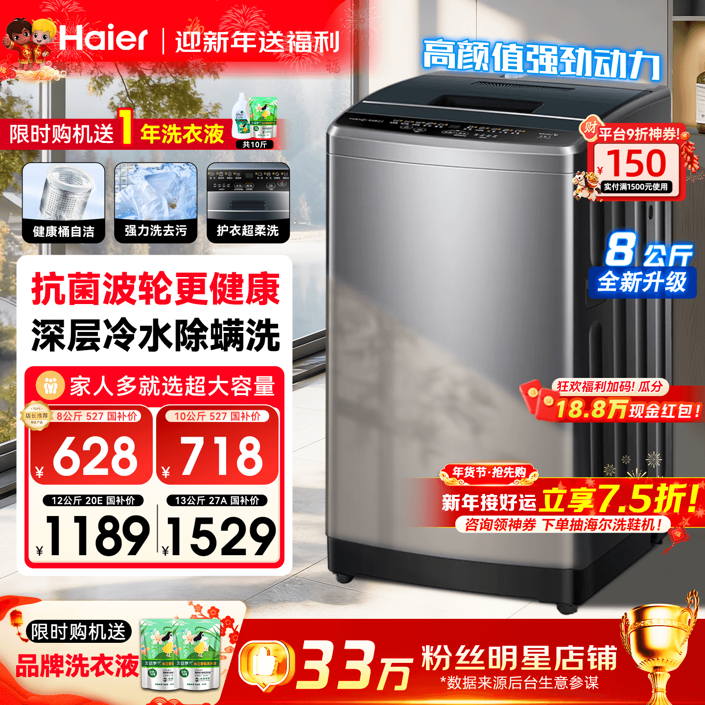 换新补贴海尔出品统帅家用全自动 8/10/12KG大容量波轮洗衣机527