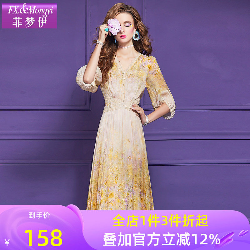 菲梦伊100桑蚕丝印花连衣裙女夏季年轻款高端真丝淑女度假风长裙