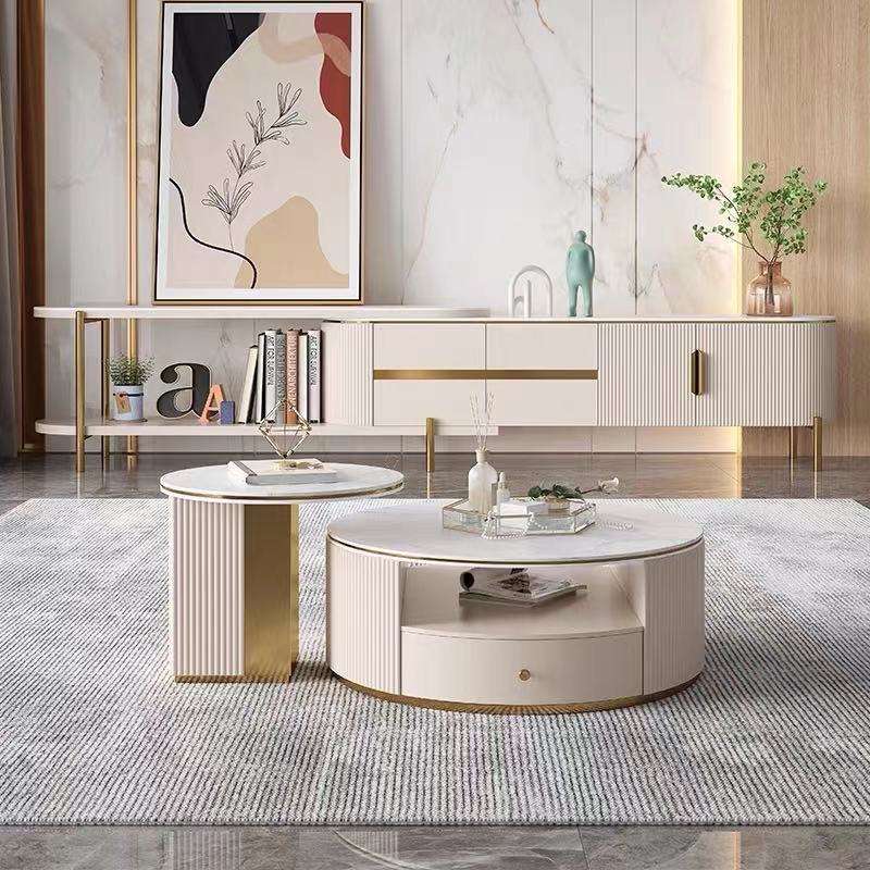 轻奢茶几电视柜组合可伸缩岩板现代简约小户型客厅家用圆形茶几桌