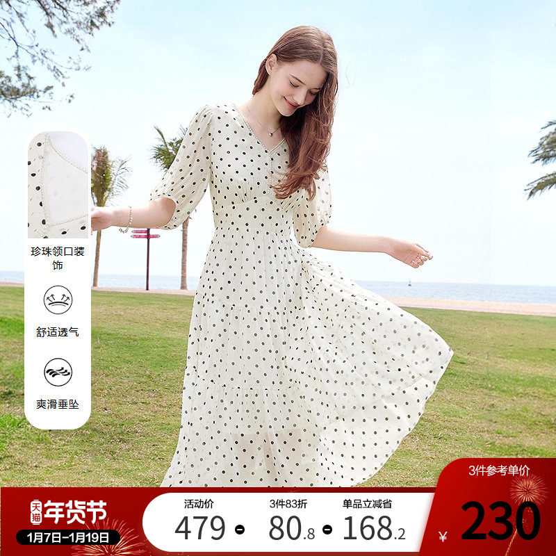 betu百图法式经典波点连衣裙女2025年夏季新款V领度假风雪纺裙