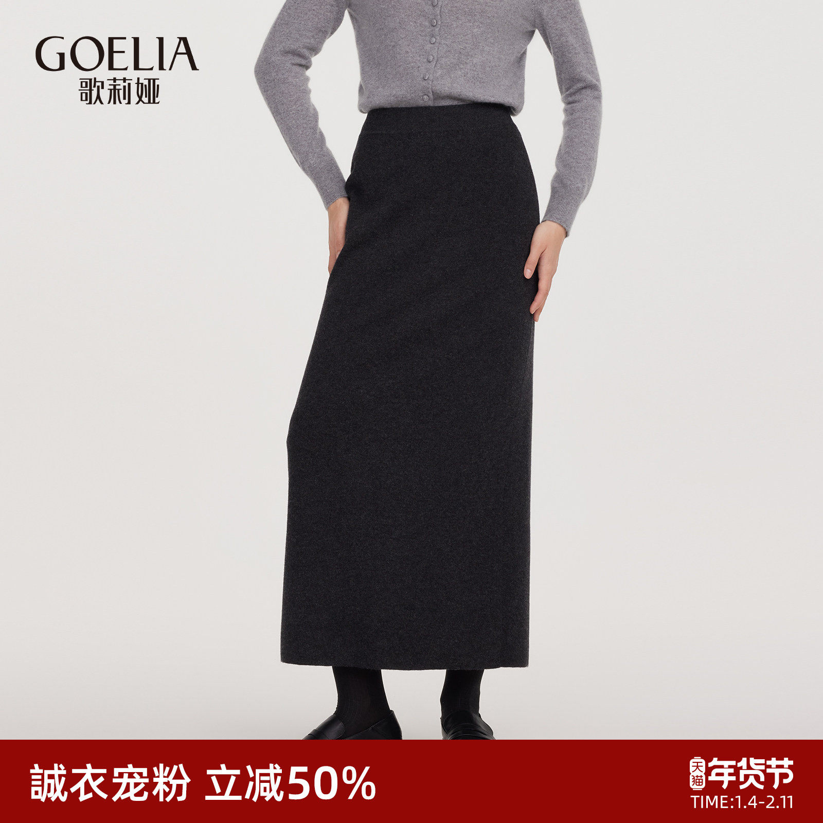 首降5折|歌莉娅黑色羊毛半身裙女秋冬2025新款气质高腰毛织长裙