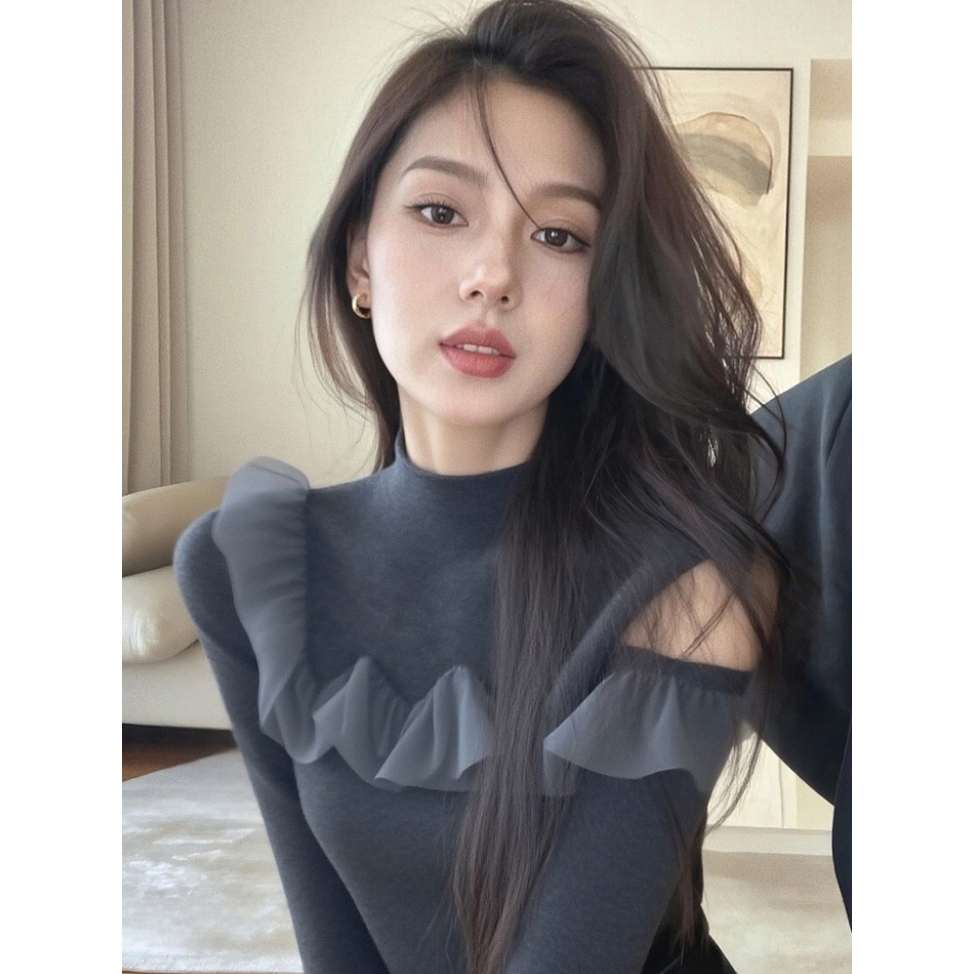 秋冬季甜辣妹镂空灰色显瘦修身打底衫女内搭设计感拼接荷叶边上衣