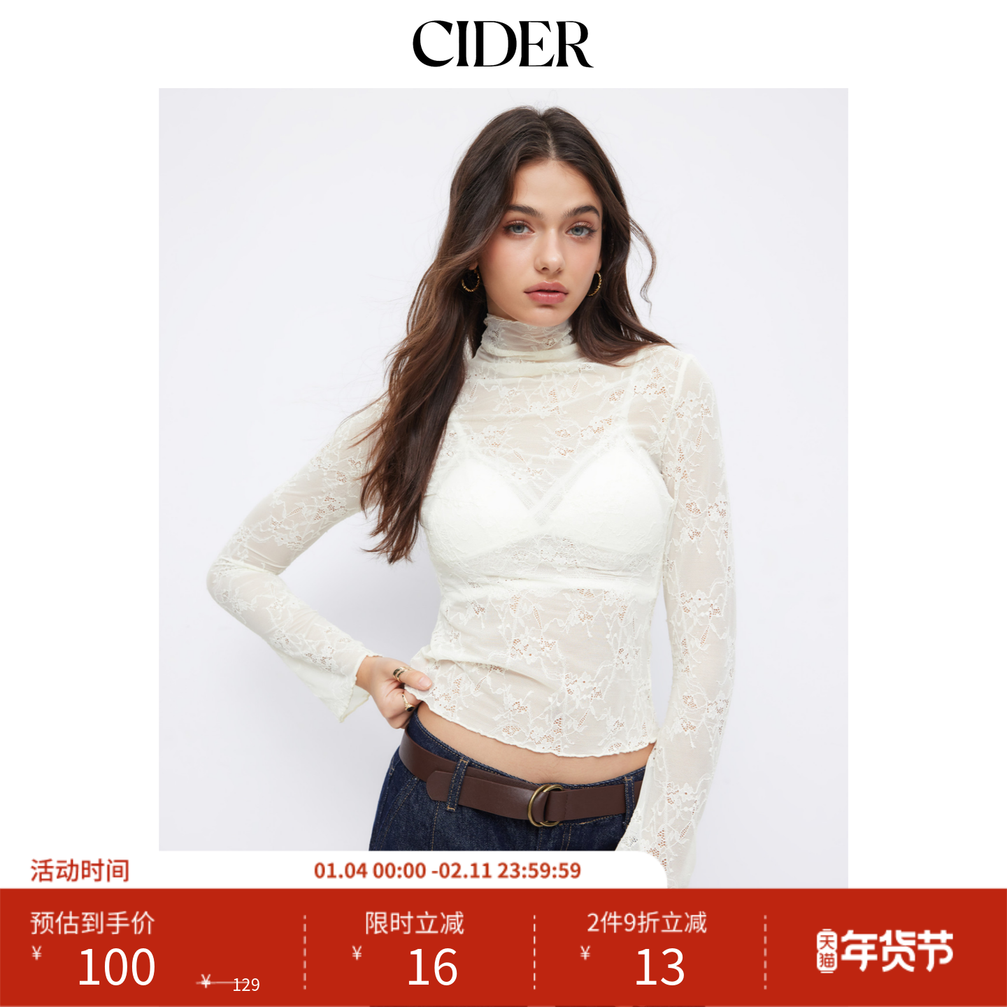 CIDER都市游牧风蕾丝碎花翻领喇叭袖荷叶边上衣套装女装114822364