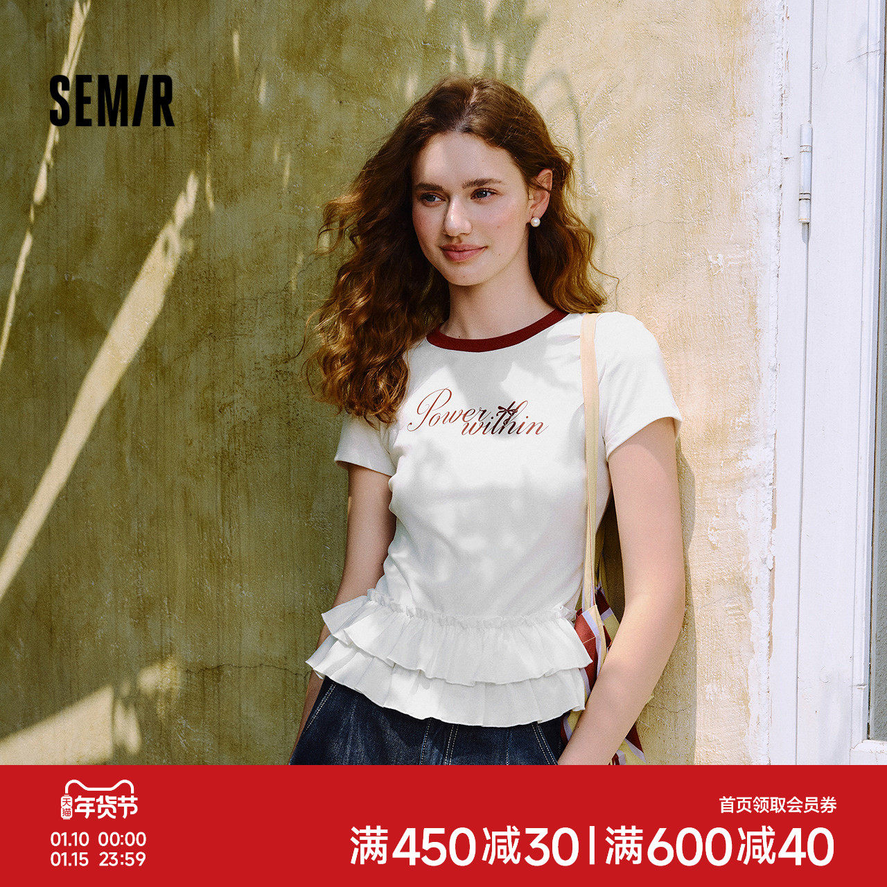 森马短袖T恤女印花撞色修身小众2025新款夏季甜美荷叶边上衣俏皮