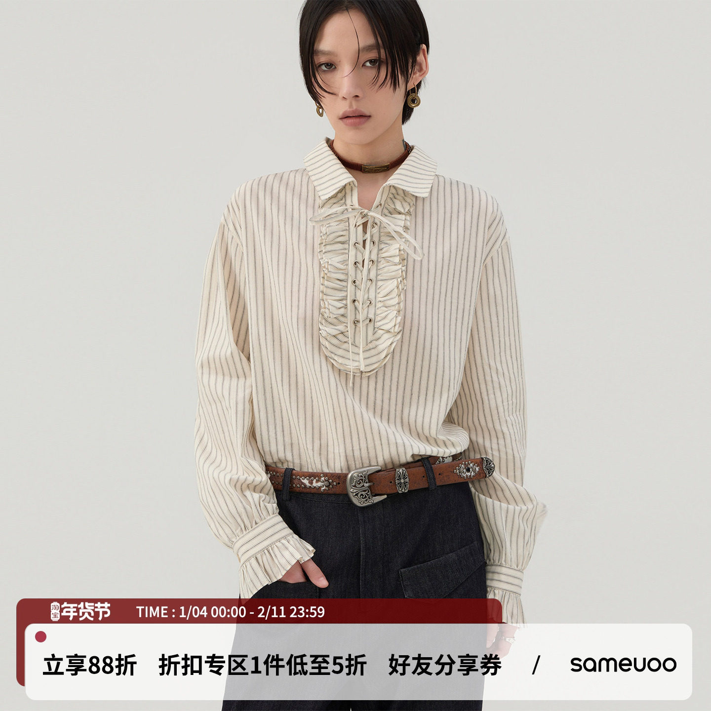 sameuoo散养文化「虚拟」立体提花条纹长袖衬衫定褶荷叶边上衣春