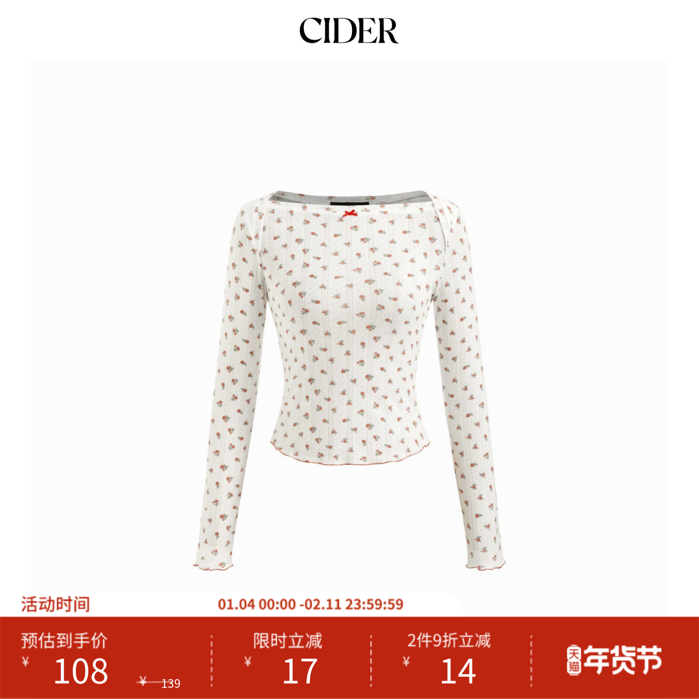 CIDER 春秋新品女装长袖T恤小碎花棉质碎花荷叶边上衣114871606