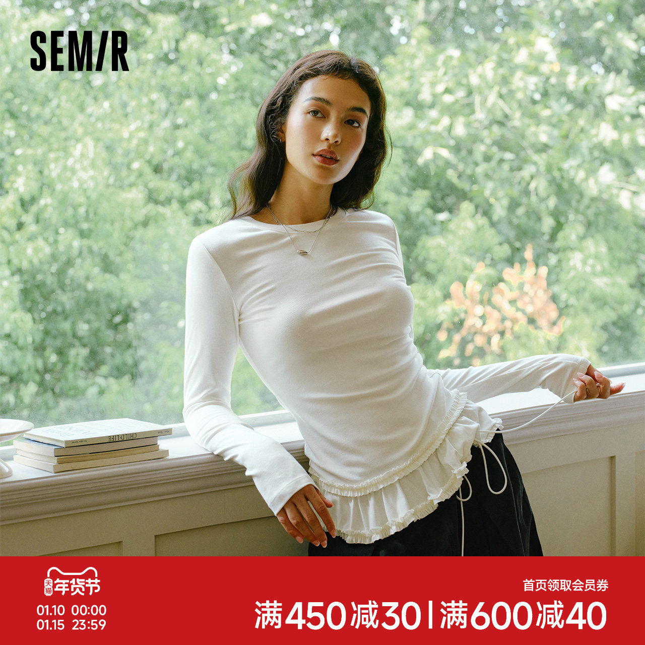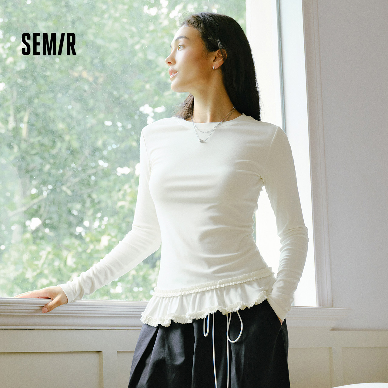 森马长袖T恤女冬纯色木耳边气质紧身2025新款荷叶边上衣打底衫