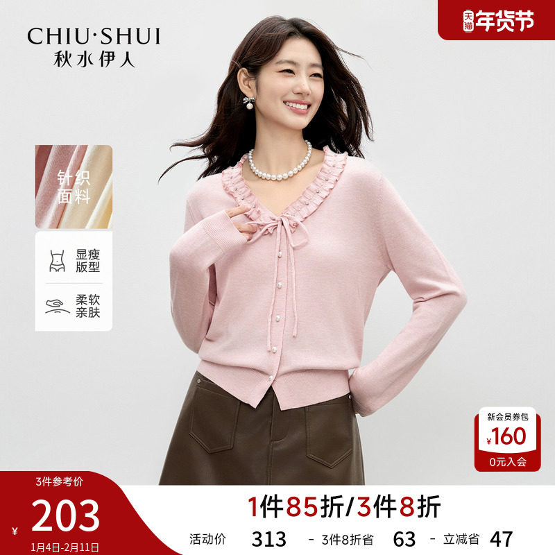 秋水伊人温柔粉色V领系带针织开衫2026年春季新款优雅荷叶边上衣