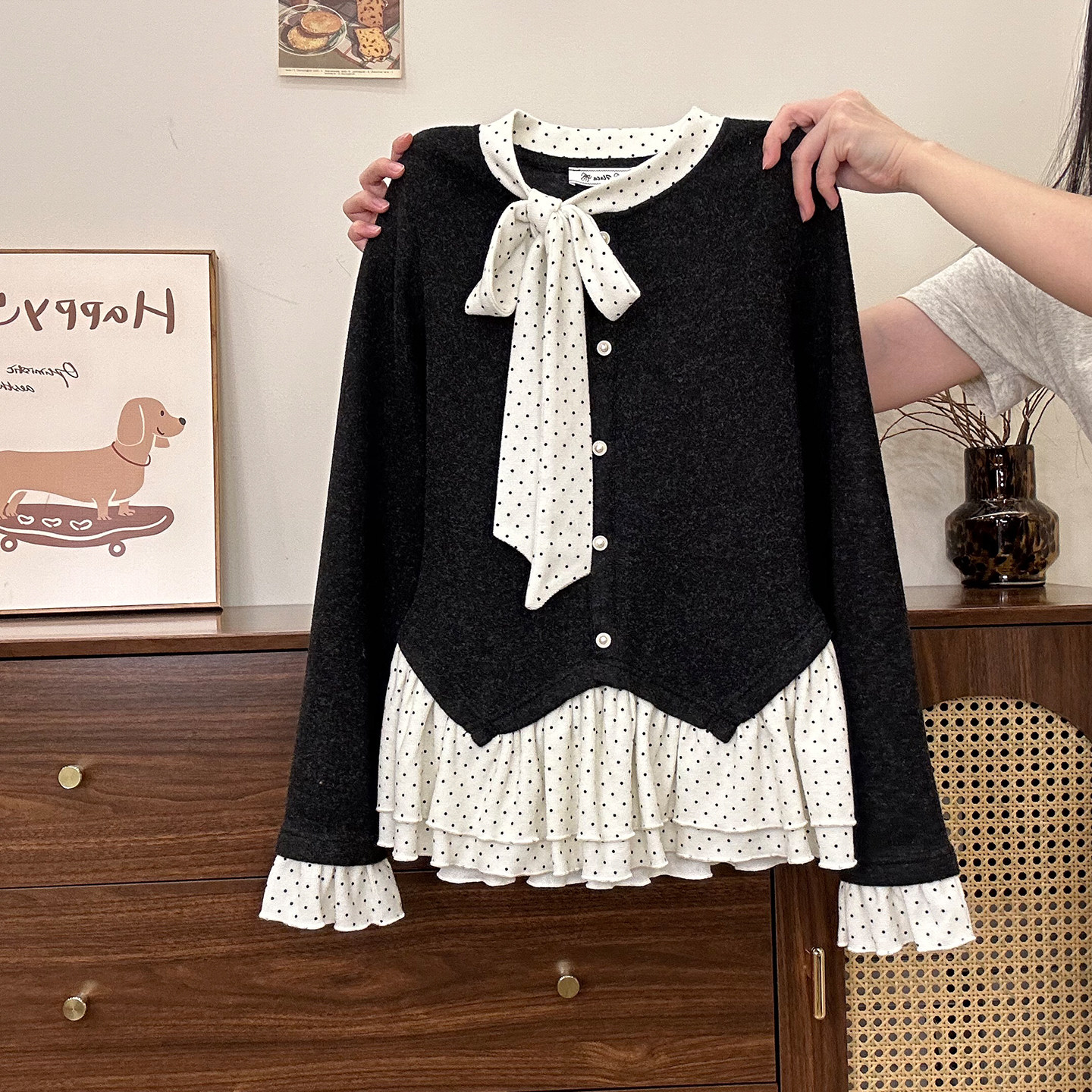 奶油的宇宙 波点荷叶花边磨毛加厚内搭长袖女韩系甜美假两件上衣