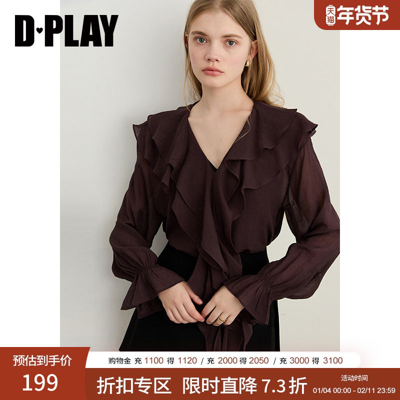 DPLAY2025年秋季新款紫色衬衫女法式气质V领荷叶边上衣长袖小衫
