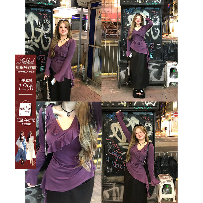 2025浆果紫V领肌理感喇叭袖显瘦通勤打底衫长袖荷叶边上衣女