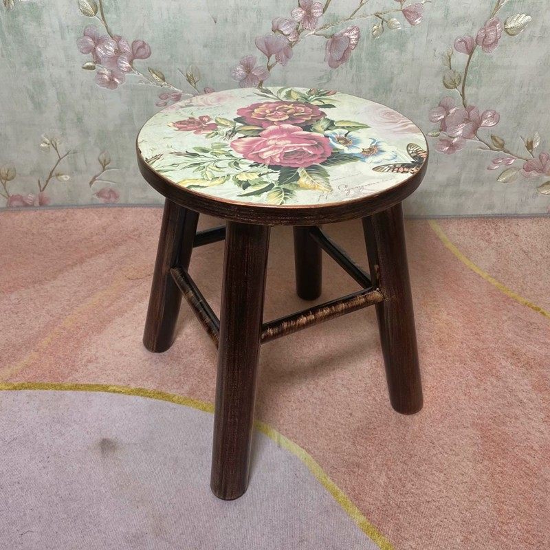 美式乡村小凳子实木家用换鞋凳欧式田园矮凳圆凳复古做旧艺术新款