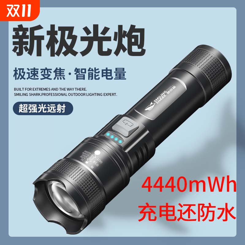 微笑鲨户外便携手电筒三档调节点烟功能随身灯带电显可充电手电筒