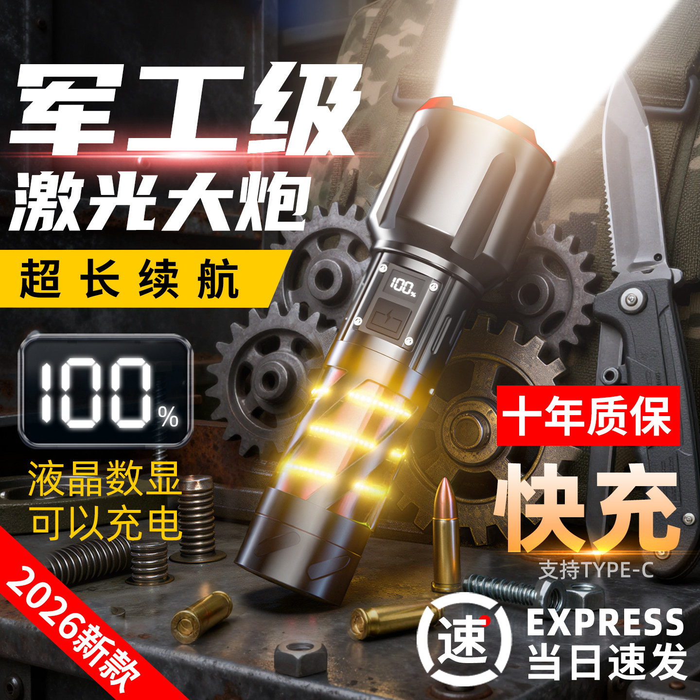 2025新款特种兵手电筒大光圈强光可充电应急远射亮超长续航可
