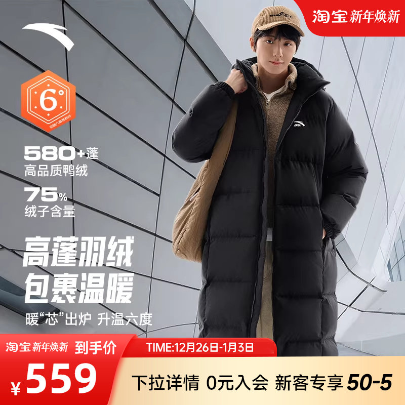 安踏面包羽绒丨过膝长款羽绒服男装冬季新款鸭绒保暖棉服运动外套