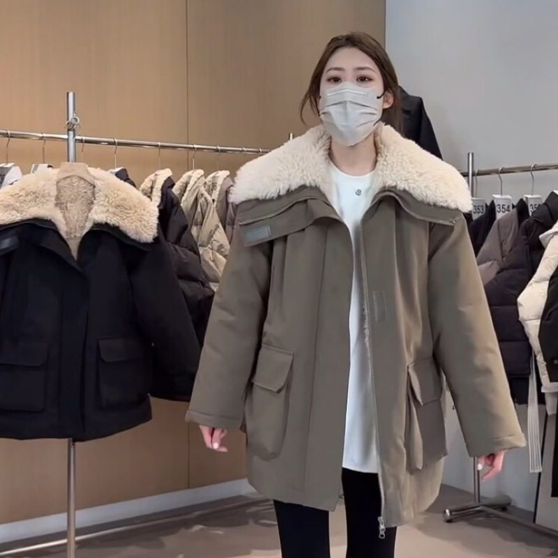 2025年冬季新款羊羔毛工装派克棉服女中长加厚显瘦冲锋衣棉袄外套