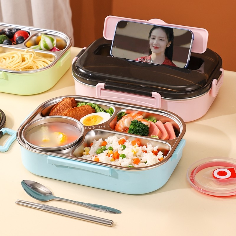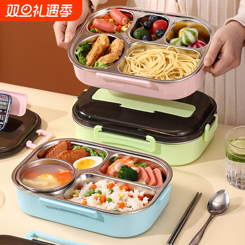 学生餐盒304不锈钢上班族保温分隔饭盒盖子塑料外壳三格四格五格