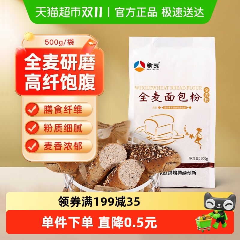 • 新良纯享全麦面包粉500g家用烘焙高筋面粉含麦麸粗粮面包吐司原料