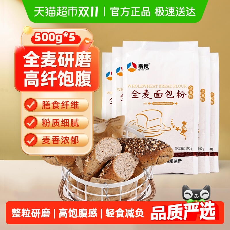 • 新良全麦面包粉家用全麦粉含麦麸吐司烘焙专用高筋面粉面包机专用
