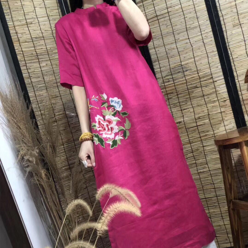 夏季新款长裙亚麻下开叉暗扣设计中式复古刺绣绣花连衣裙女长裙新