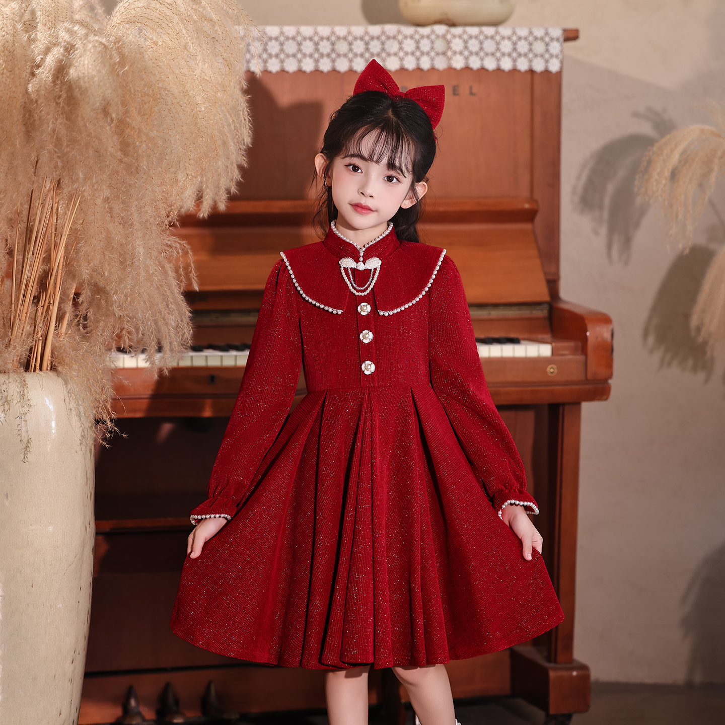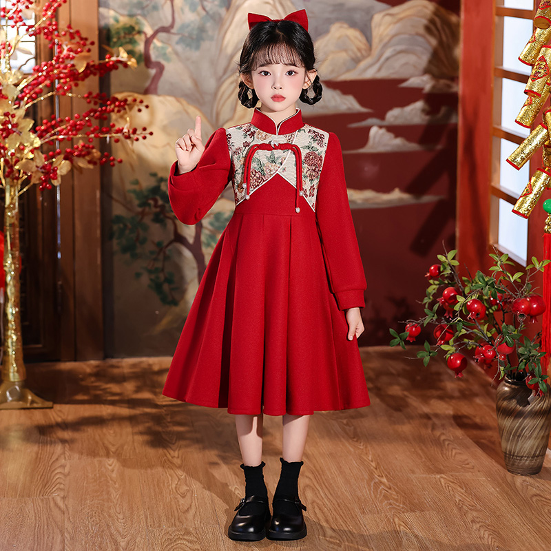 女童旗袍连衣裙冬季2025新款小女孩洋气公主裙秋装儿童红色裙子冬