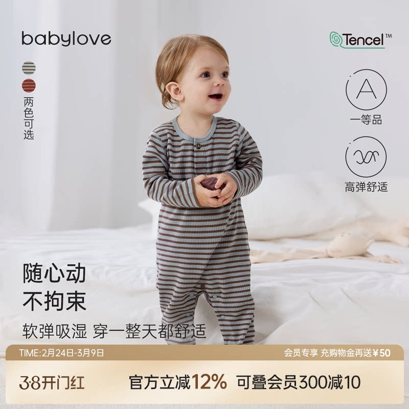babylove婴儿连体衣春秋宝宝哈衣爬服莫代尔棉睡衣条纹弹力打底衣