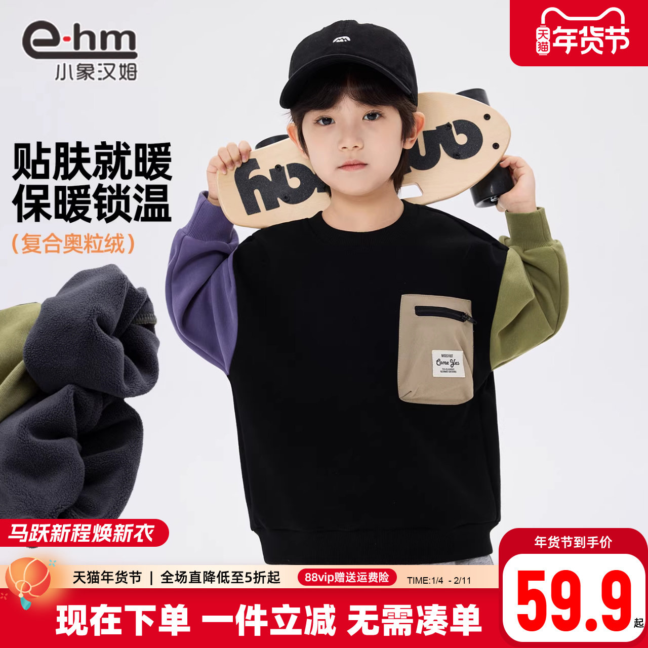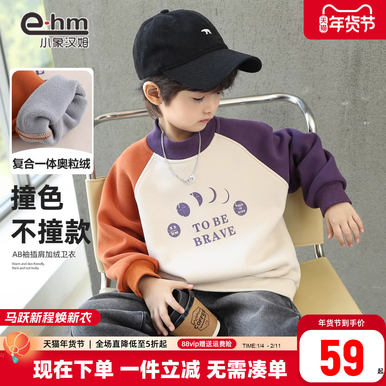 小象汉姆童装男童卫衣冬装2025新品儿童冬装加绒拼接上衣中大童
