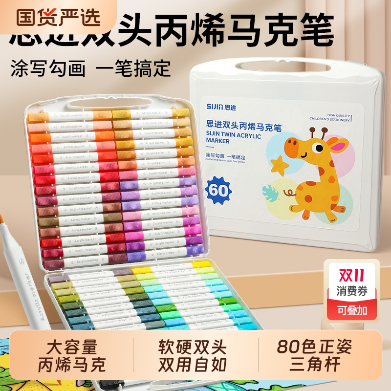 丙烯马克笔儿童水彩笔笔芯小学生美术画画专用不透色可叠色幼儿园双头无毒可水洗36/48/80/60画笔软头diy硬头