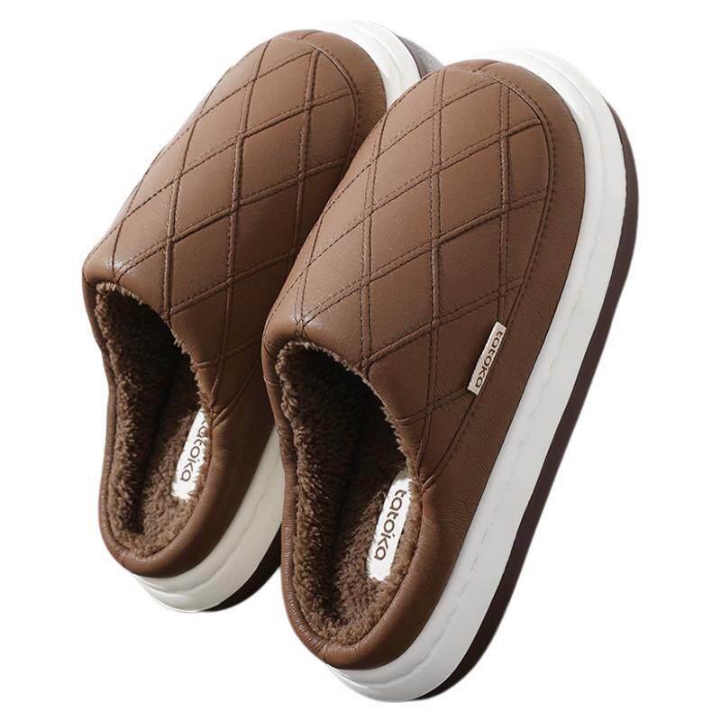 男士棉拖鞋家居室内冬季PU皮面防水厚底防滑加绒保暖毛绒拖鞋男款