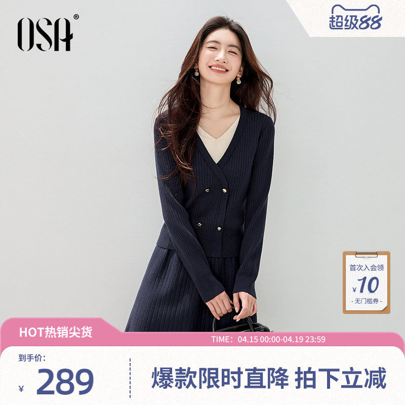 OSA欧莎撞色V领假两件针织套装女装冬季新款毛衫半裙两件套内搭裙