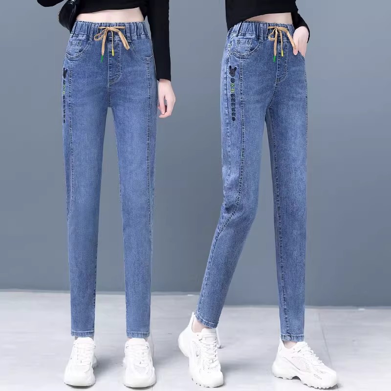 松紧腰牛仔裤女新款高腰哈伦裤百搭修身显瘦直筒铅笔小脚长裤洋气