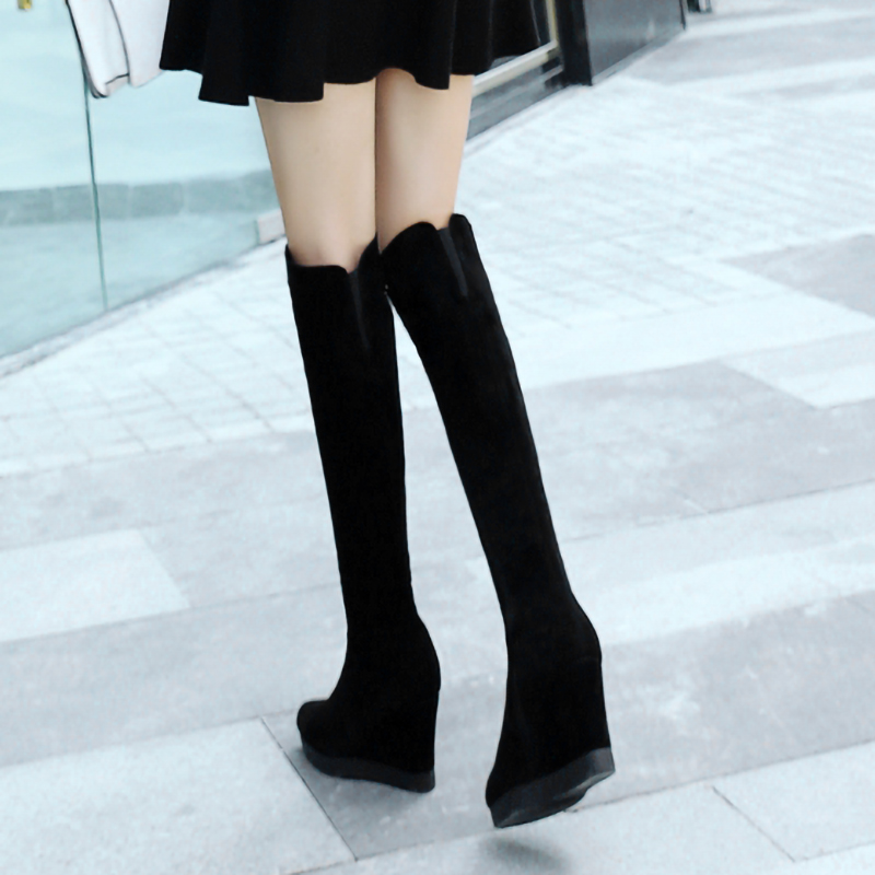 磨砂牛皮真皮厚底坡跟长靴高跟防水台过膝靴侧拉链秋冬高筒靴子女