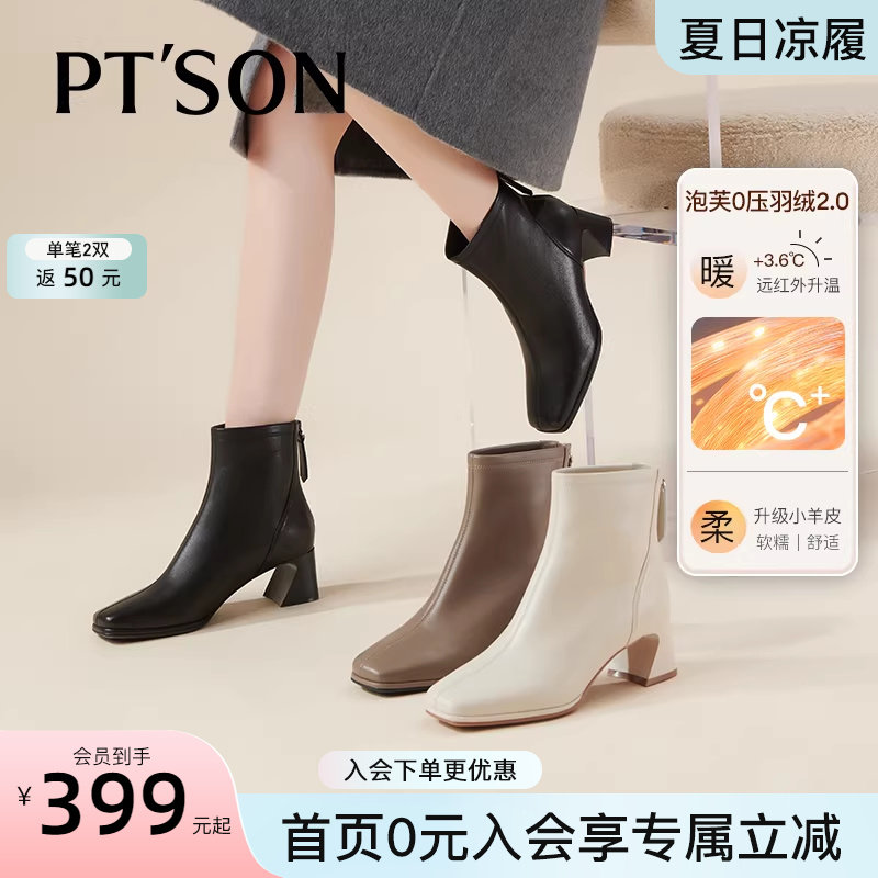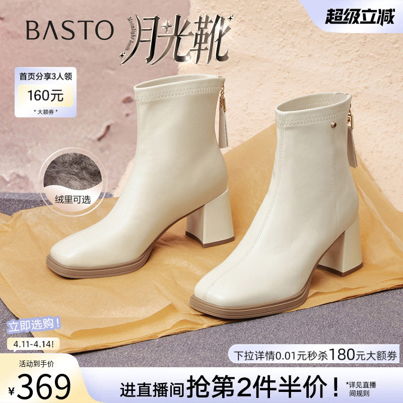 百丽班尼法式单靴春秋新款白色小短靴加绒瘦瘦靴高跟裸靴马丁靴子