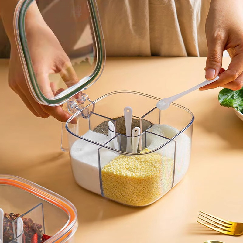 北欧厨房调料盒调味罐塑料组合套装4格一体带勺子分格带盖调味盒