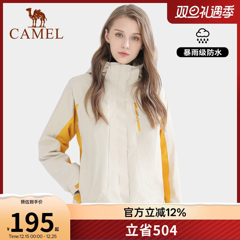 骆驼羽绒服黄色冲锋衣男女三合一可拆卸防水防风户外登山服两件套