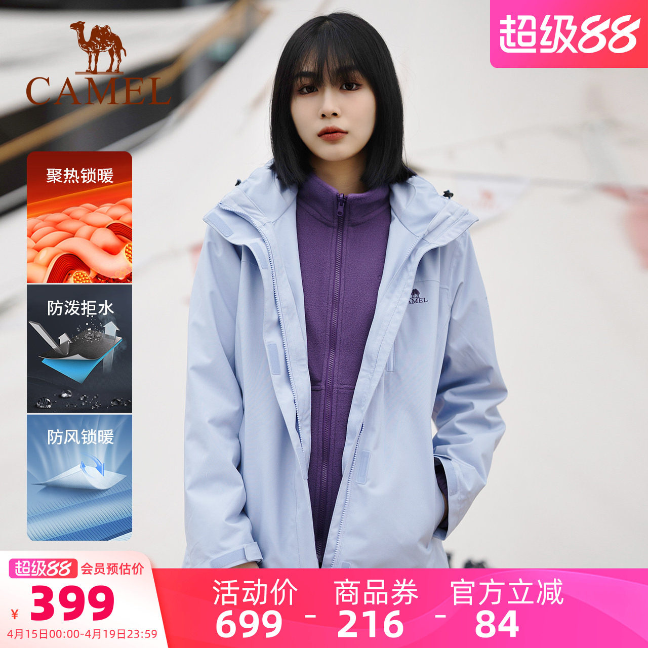 【清仓】骆驼冲锋衣男女外套三合一两件套防风防水旅游户外登山服
