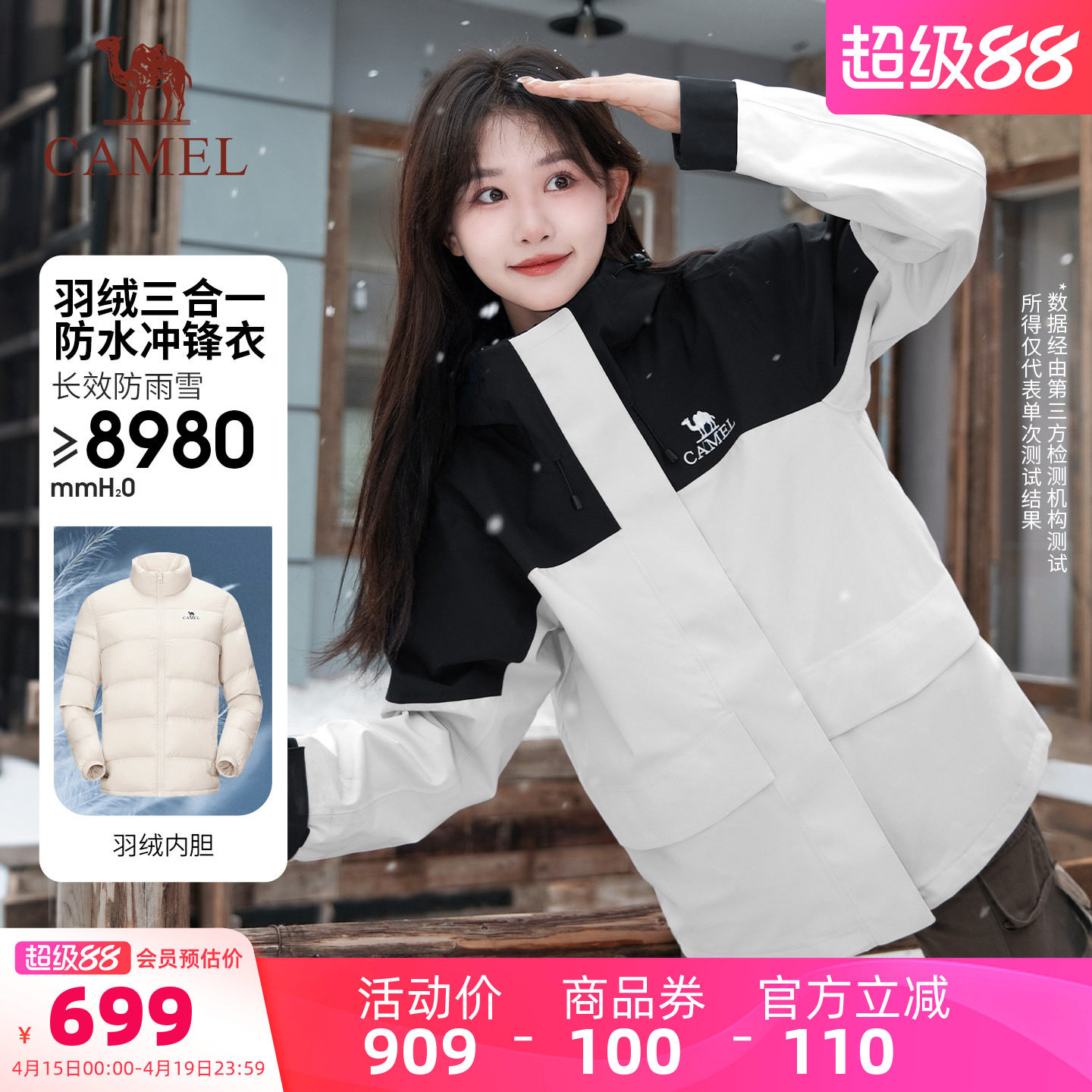 骆驼户外冲锋衣男女三合一可拆卸外套防水两件套冬羽绒进藏登山服