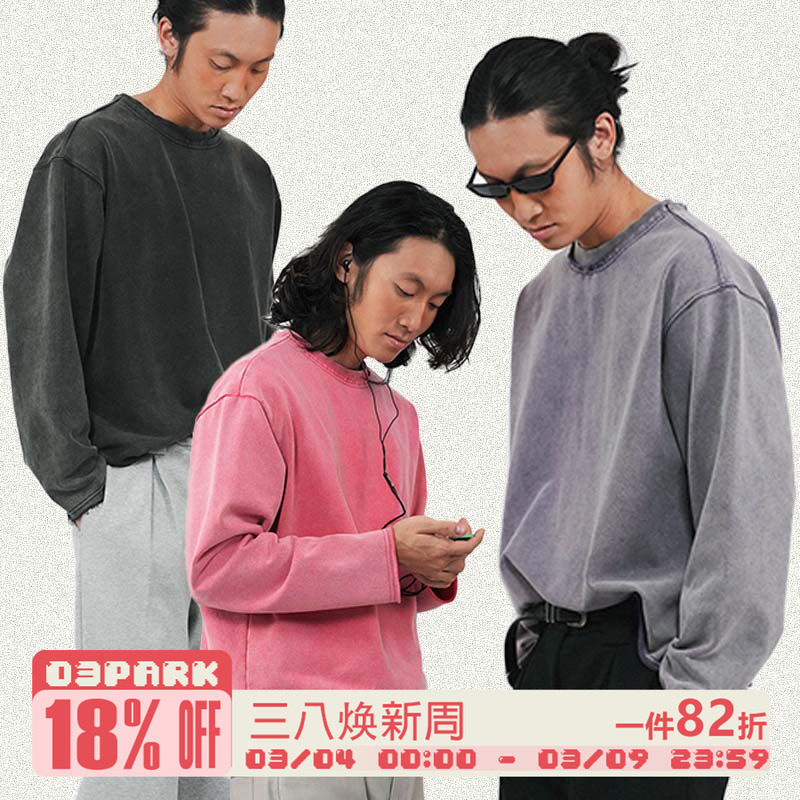 O3PARK秋新款毛边炒色泛白渐变长袖圆领洗褪做旧卷边短款宽松卫衣