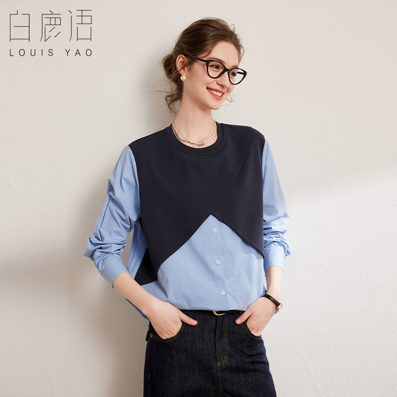 白鹿语撞色假两件拼接设计感上衣春秋款休闲圆领微落肩宽松卫衣女HY50046