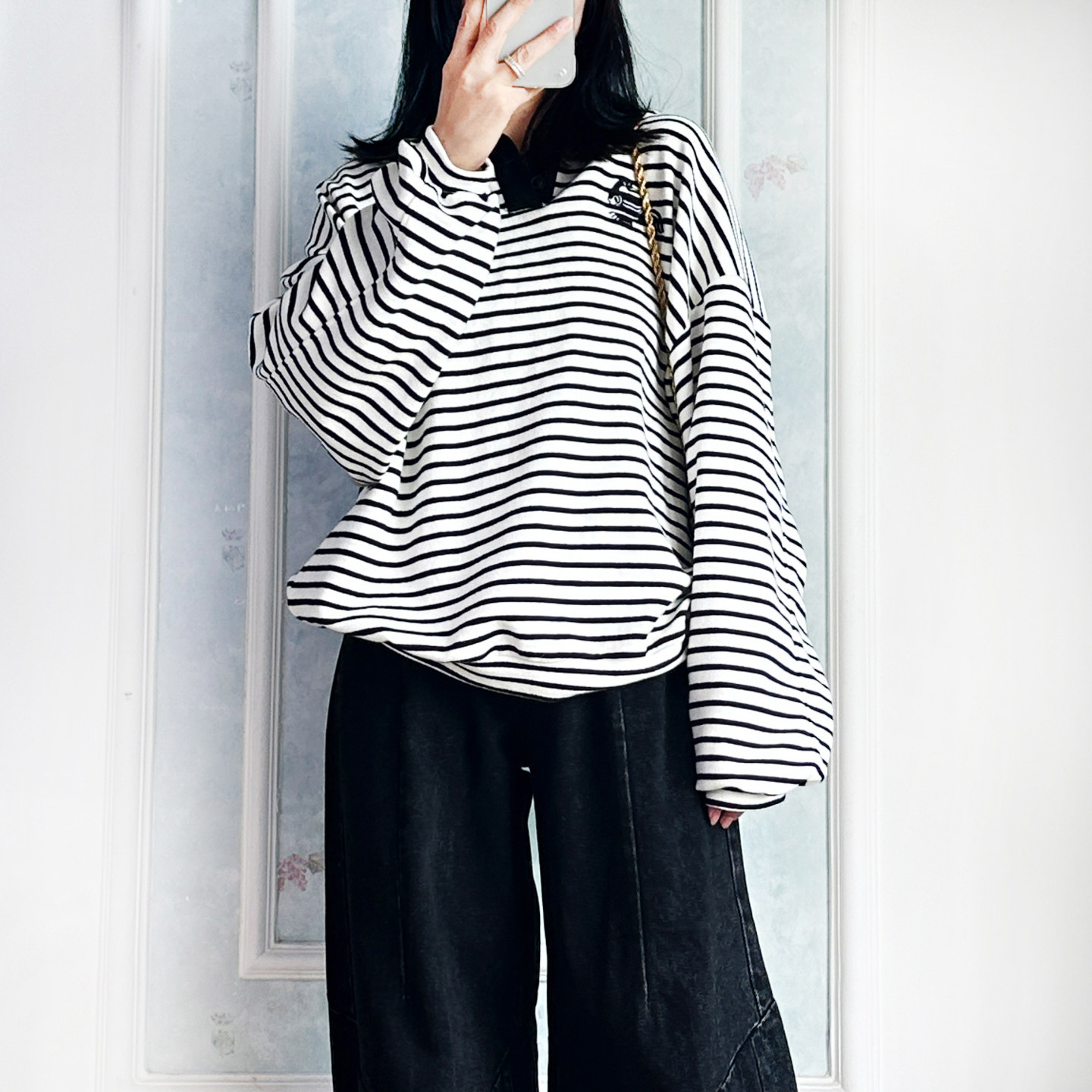DONEED春季新款设计感大版条纹长袖T恤针织打底衫宽松卫衣女